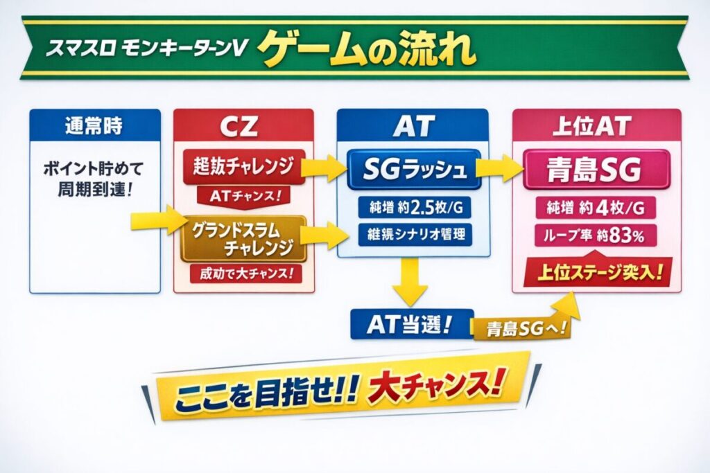 この記事では、初心者でも迷わないように天井・狙い目・やめどきを「表+手順」で整理しつつ、CZ/ATの流れ上位AT(青島SG)のポイントまでまとめます。
